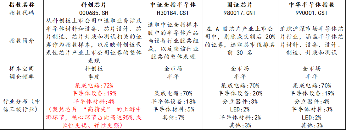 市场上芯片相关指数众多,选取当下热门的科创芯片、半导体等指数进行比较,可以发现,虽然均聚焦为芯片板块,但在指数编制上却大有不同。一句话总结:科创芯片指数聚焦芯片核心环节,“含芯量”更高,弹性强,成长性高。