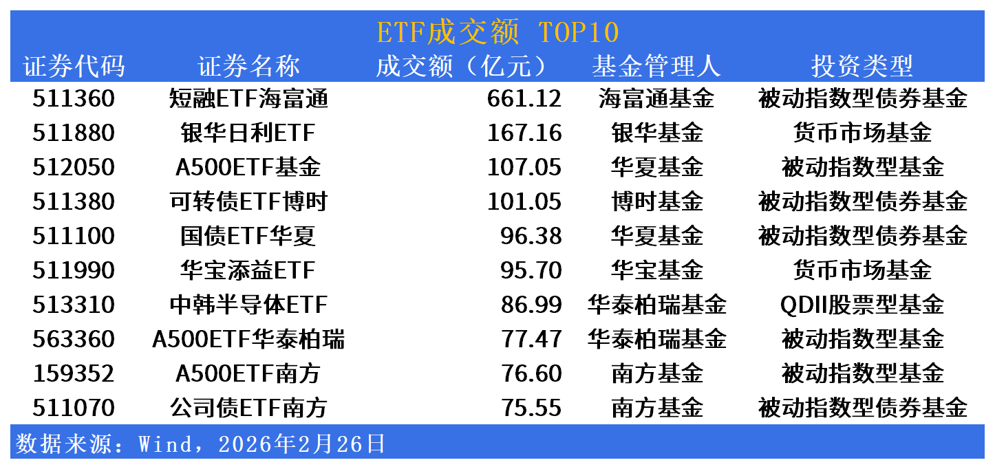 债券型ETF持续占据流动性主导,短融ETF海富通(511360)单日成交额661.12亿元稳居榜首;银华日利ETF(511880)成交167.16亿元,可转债ETF博时(511380)成交101.05亿元,国债ETF华夏(511100)成交96.38亿元。