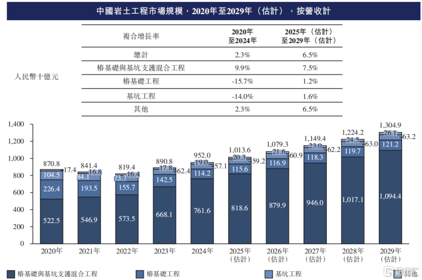 招股书中称,未来受中国政策及技术进步等因素推动,岩土工程行业市场规模将稳步增长,预计到2029年岩土工程市场空间将达到1.3万亿元,2025年至2029年的复合增长率为6.5%。