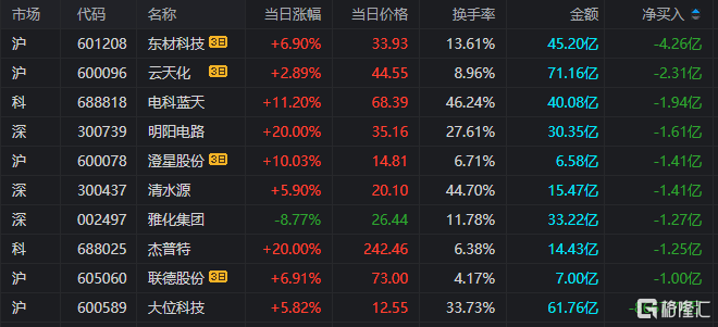 龙虎榜单日净买入额前三为沪电股份、华胜天成、高澜股份,分别为14.13亿元、4.25亿元、3.76亿元。