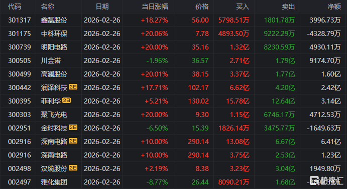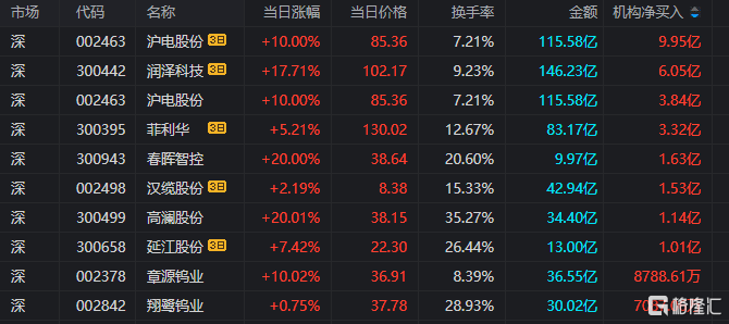 龙虎榜中涉及机构专用席位的个股中,单日净买入额前三为沪电股份、春晖智控、高澜股份,分别为3.84亿元、1.63亿元、1.14亿元。