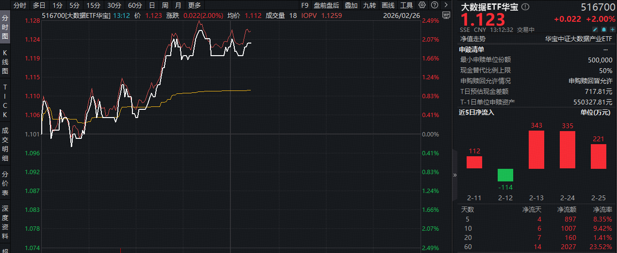 或由于英伟达亮眼财报,粉碎海外AI泡沫担忧,今日(2月26日)重点布局国产算力(IDC、服务器)、国产AI应用领域的大数据ETF华宝(516700)场内涨幅盘中上探2.27%,现涨2%,上交所数据显示,该ETF此前3日连续吸金近900万元,反映资金看好大数据方向后市表现,逐步进场布局!