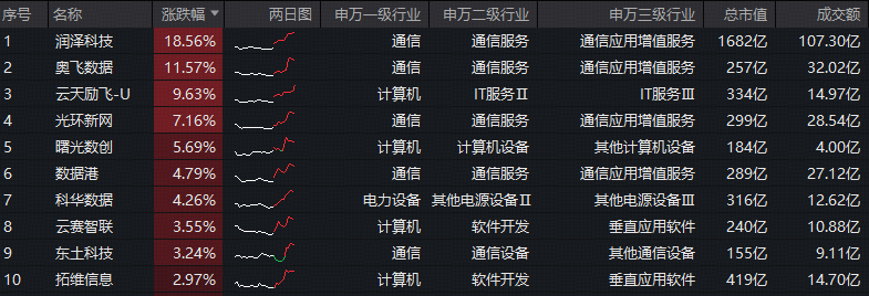 成份股方面,润泽科技领涨超18%,奥飞数据涨逾11%,云天励飞涨超9%,光环新网涨超7%,曙光数创、数据港、科华数据、云赛智联、东土科技等个股跟涨。