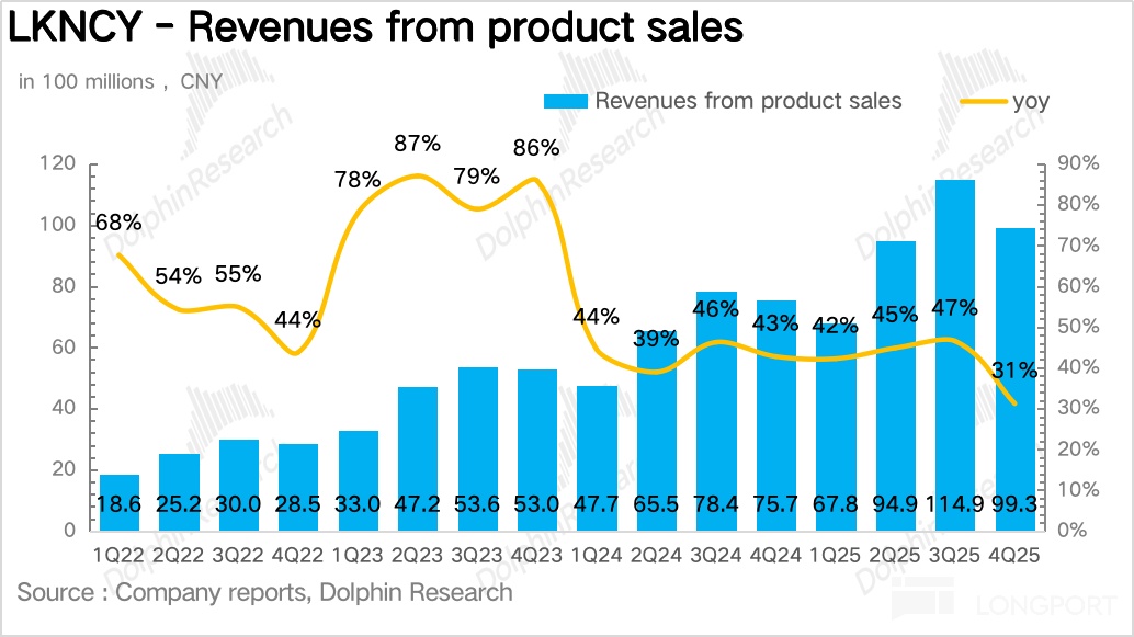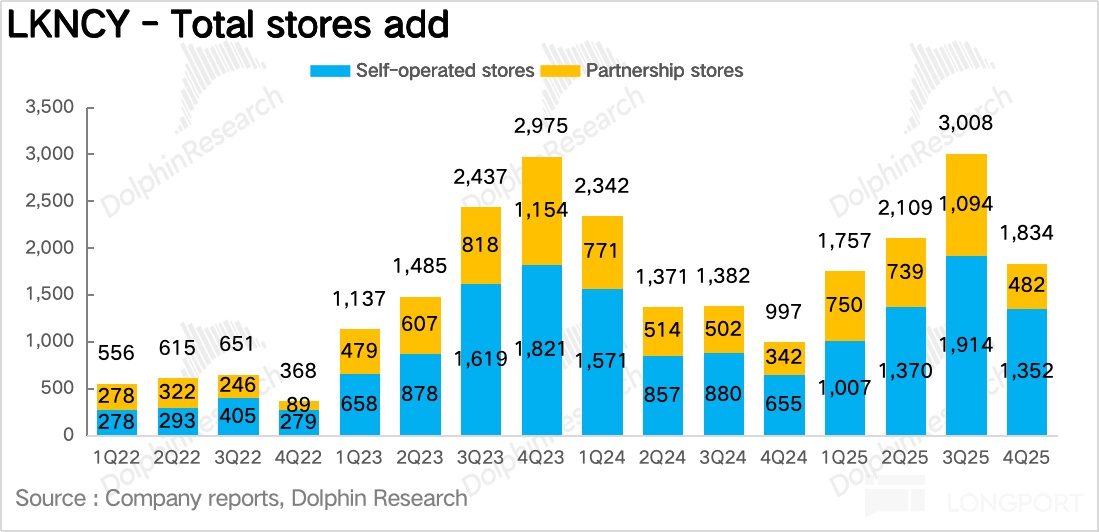Q4 瑞幸实现总营收 127.8 亿元,同比增长 32.9%,不及预期。拆分业务来看,自营门店实现营收 99 亿元,同比增长 31.2%,加盟业务收入 28.5 亿元,同比增长 39.3%,增速快于自营门店的增长,核心还是在于 2025 年瑞幸系统性降低了加盟门槛,通过加盟模式加速下沉抢占点位。
