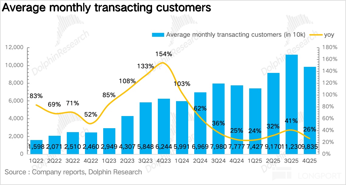 月活跃付费用户数增速放缓。Q4 瑞幸月活跃付费用户数为 9800 万,同比提升 27%,环比 2、3 季度明显放缓,由于外卖大战期间,平台高额补贴吸引了大量价格敏感型用户,补贴退潮后,这部分用户活跃度骤降,拉低整体用户增速,说明外卖用户的私域转化留存率并不算高。