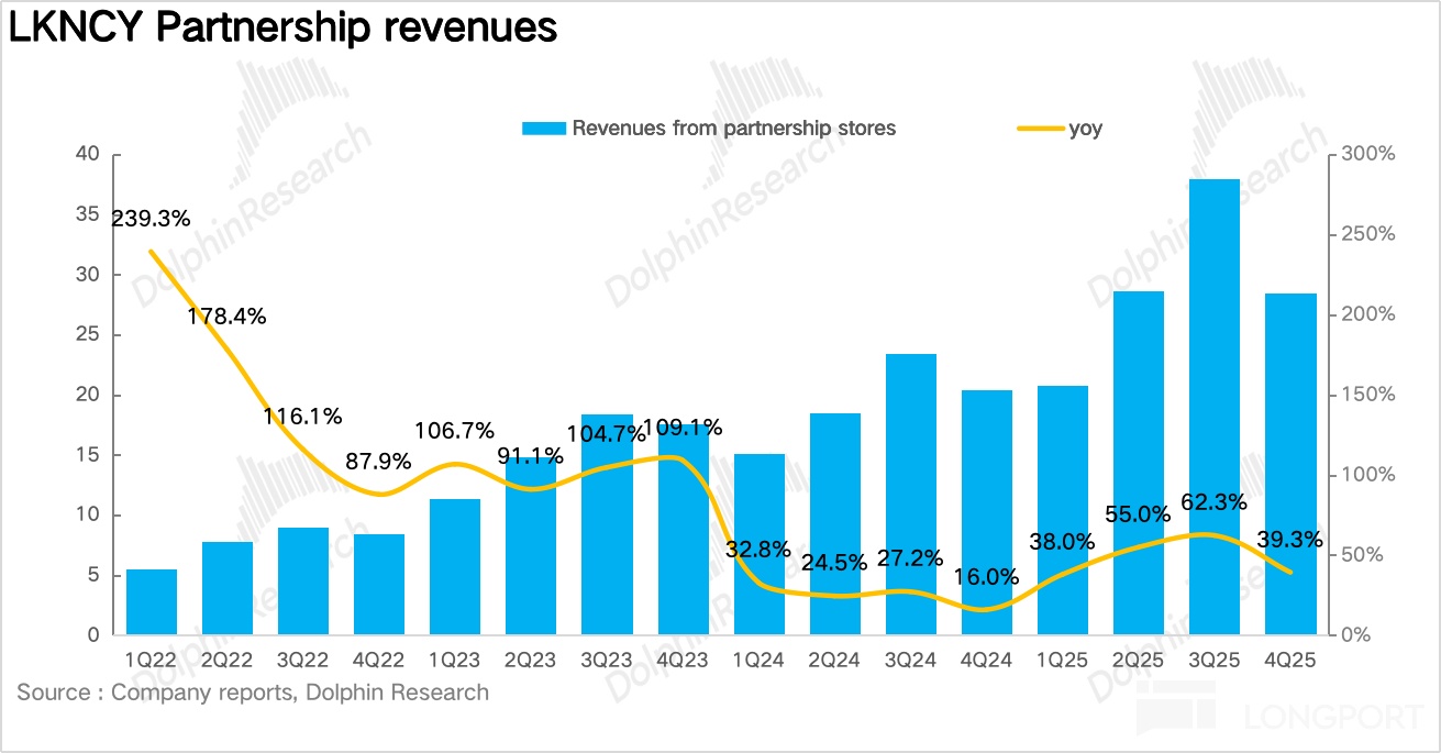 虽然减少了用户端的补贴,另一个值得注意的动作在于Q4 瑞幸加大了对加盟门店(尤其是杯量偏低)的补贴,海豚君认为,这里一方面是由于 2025 年瑞幸经历了在下沉市场大规模开设加盟门店抢占市场,而这些加盟商即将迎来第一个淡季(一季度),可以帮加盟商平稳过渡,另外,也反映出尽管瑞幸当前迈入了 3 万家俱乐部,公司仍然认为通过加盟门店在下沉地区抢占市场的必要性。