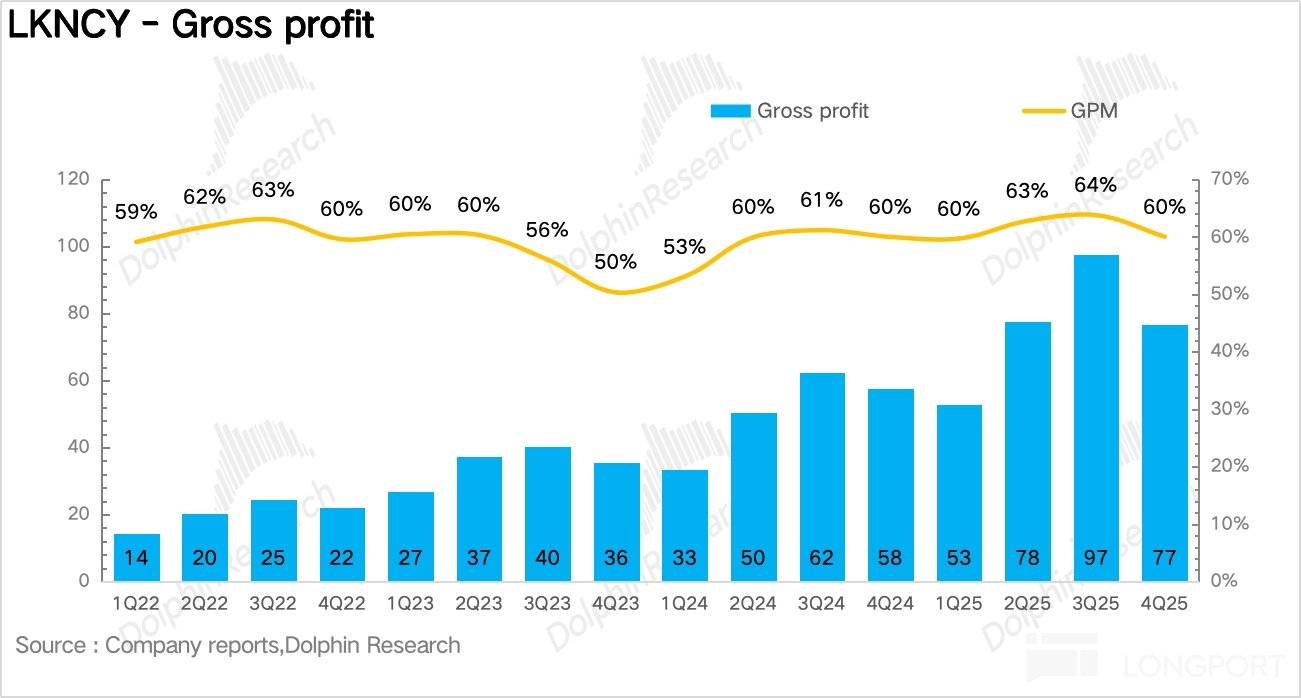 Q4 毛利率整体保持平稳,费用端拆分看,四季度公司的配送费用达到 16.3 亿元,同比增长 94%,占营收的比重从去年同期 8.7% 大幅拉升到 12.8%,仍然是利润端最大的拖累项。但从中期来看,由于外卖补贴并不可持续,因此对于瑞幸来说,本季度飙升的配送费用实际上也只是短期影响,后续伴随自提比例的提升,配送费用率大概率还是会回落至 10% 以下的常态化水平。