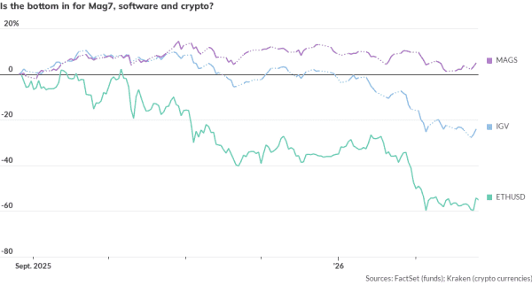 英伟达首席执行官黄仁勋已经表示,市场在软件板块的抛售中判断失误。而华尔街死多头,Research at Fundstrat联合创始人兼研究主管汤姆·李与黄仁勋看法相近。他认为,软件板块、华丽七雄股票以及加密货币的抛售已接近尾声。
