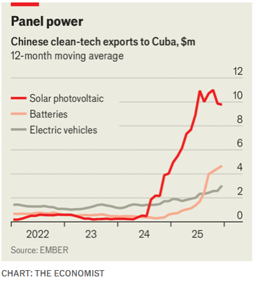 根据智库Ember汇编的中国出口数据,截至2025年4月的12个月里,古巴从中国进口的太阳能电池板数量增长了34倍,增速为全球最快。