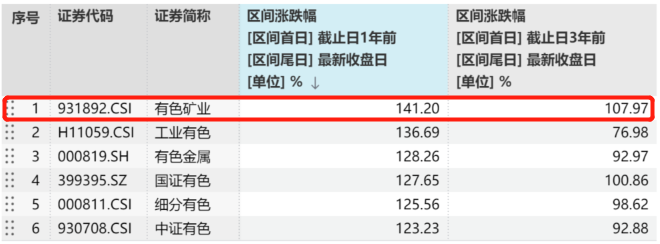 从历史表现来看,有色金属矿业指数近一年涨幅达141%,近三年涨幅108%,在主流有色指数中位居第一。