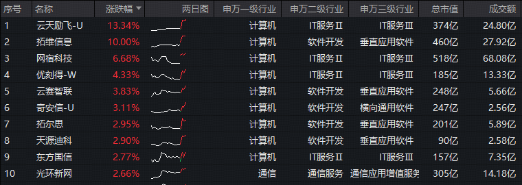 成份股方面,拓维信息涨停,云天励飞涨超13%,网宿科技涨逾6%,优刻得-W、云赛智联、奇安信-U、拓尔思等个股跟涨。
