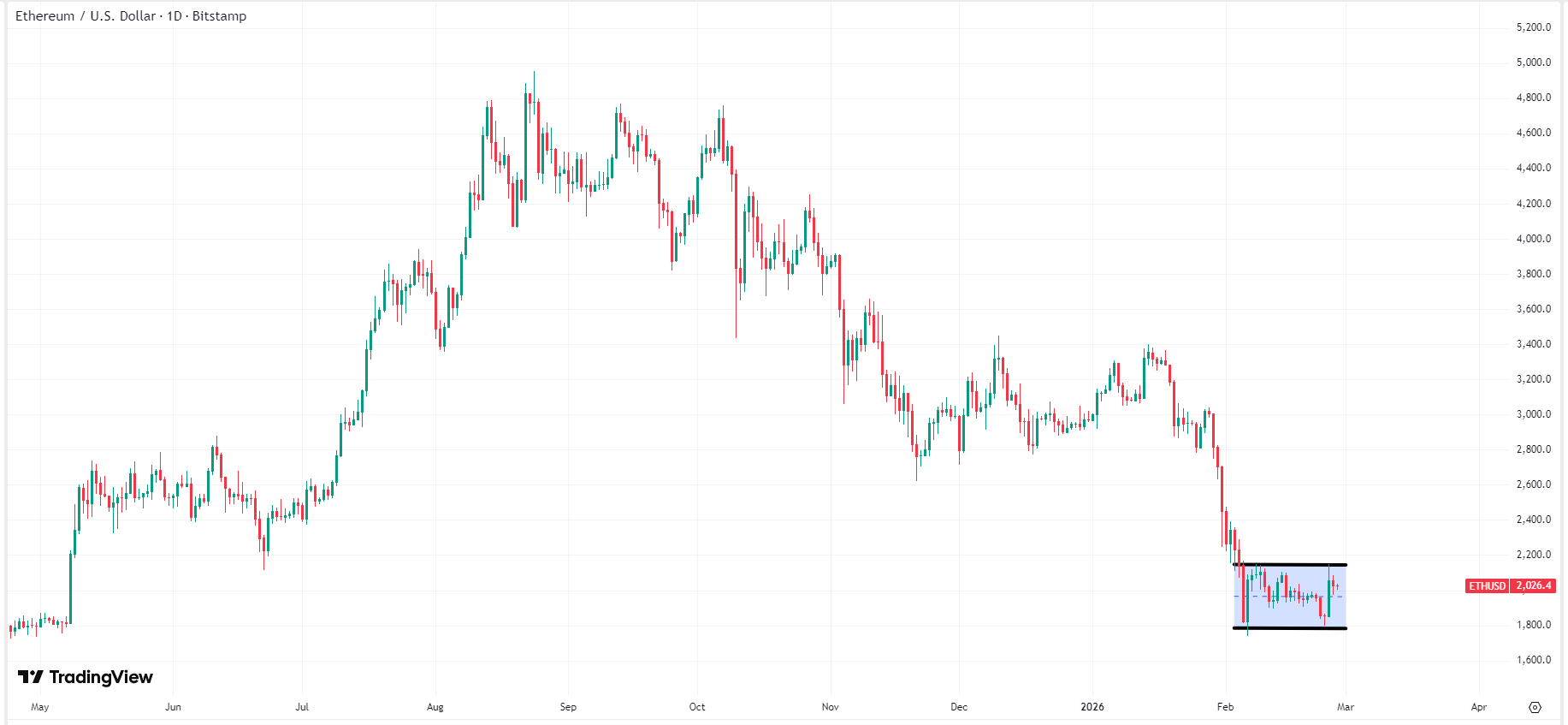 周五(2月27日),加密货币市场集体回调,其中以太坊 (ETH) 价格大跌1.4%,回落至2,000美元附近,当前价格为2,026美元。