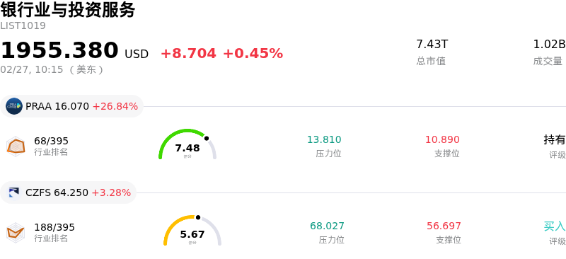 阿默普莱斯金融 (AMP) 盘中下跌3.67%, 所属行业银行业与投资服务上涨0.45% ,公司涨幅跑输行业涨幅,行业涨幅前三股票 PRA Group Inc (PRAA) 上涨 26.84%;Marathon Bancorp Ord Shs (MBBC) 上涨 5.99%;Citizens Financial Services Inc (CZFS) 上涨 3.28%。