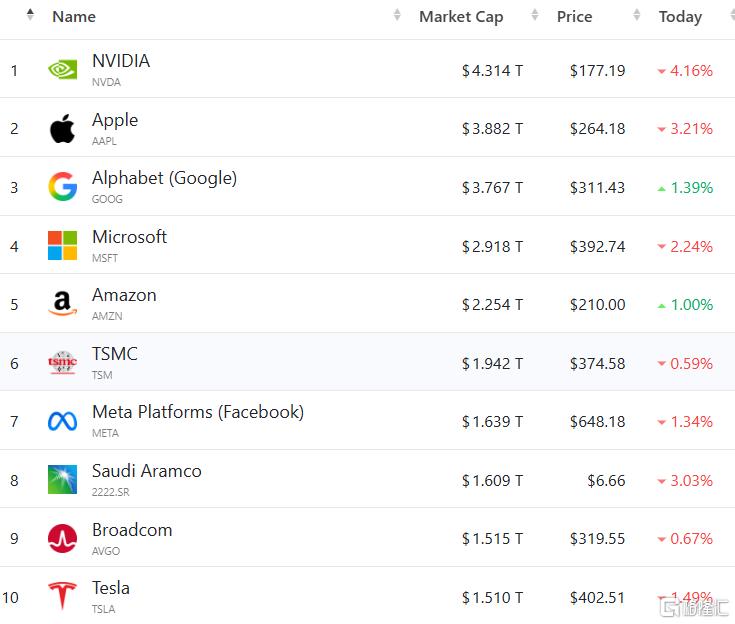 仅次于英伟达、苹果、谷歌、微软、亚马逊和台积电6家巨头,在全球市值排行榜中位列第7。