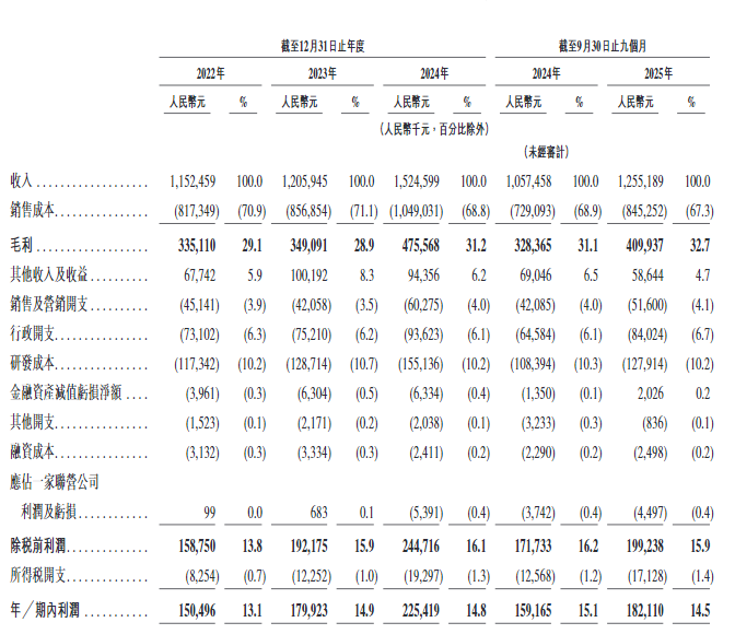 从业务结构看,汽车产品已成为绝对核心,收入占比从2022年的42.7%持续攀升至2025年前九个月的62.9%;消费及医疗科技产品占比有所下降,2022年到2024年的占比分别为40.9%、32.3%、32%;具身机器人产品虽然目前基数较小,但增速显著,2025年前九个月收入已达1553万元,较2024年同期的407.6万元增长280.9%,展现出强劲增长势头。