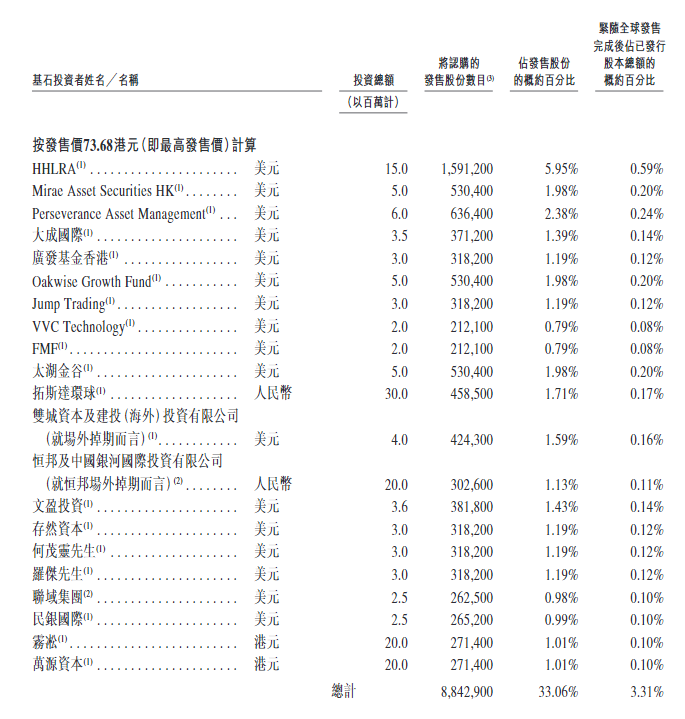 本次发行成功引入21家基石投资者,合计认购约884.29万股,占全球发售股份的33.06%。基石名单覆盖国际顶级投资机构及产业资本,包括HHLR、Mirae Asset Securities HK、Perseverance Asset Management、大成国际、广发基金香港、Oakwise Growth Fund、Jump Trading等知名机构,以及拓斯达环球、双城资本及建设(海外)投资、文益投资、存然资本、民银国际等多元背景投资者。