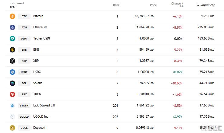 此外,Solana跌超10%,狗狗币跌超9%,艾达币跌超8%,XRP跌近9%,BNB跌超5%。