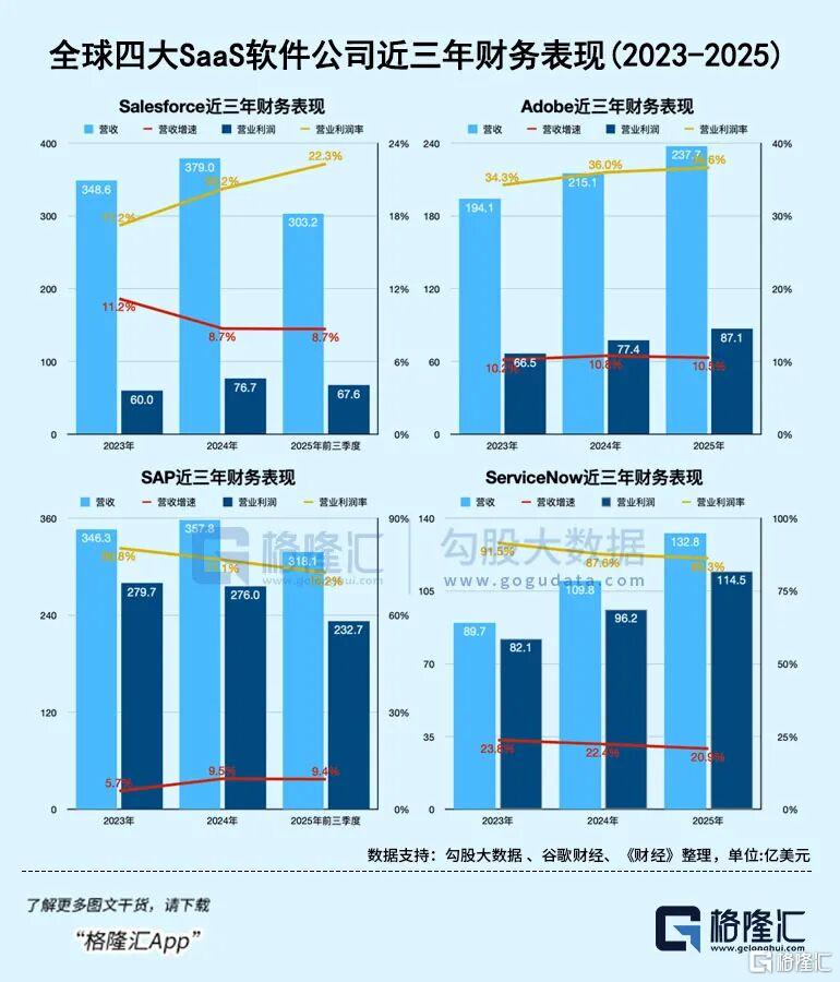 尽管面临质疑,Salesforce、SAP、Adobe等软件巨头近三年的毛利率都在不断增长,去年都创下了历史新高。
