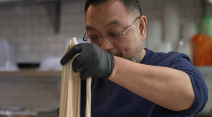 如今,他经营着两家兰州拉面馆,供应家乡的招牌菜,清真牛肉汤拉面配萝卜。