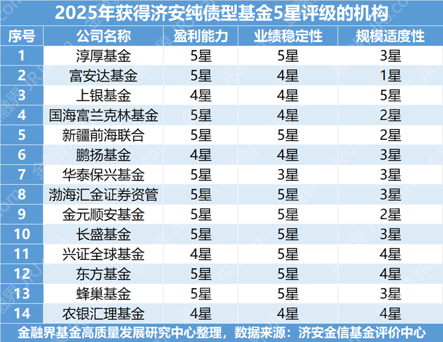 不过,选基金也是个技术活。根据济安金信2025年末最新的公募债券型基金公司评级来看,目前市场上已经有一批“尖子生”冒了出来。淳厚基金、上银基金、国海富兰克林、鹏扬基金等14家机构获得了济安金信的五星评级。