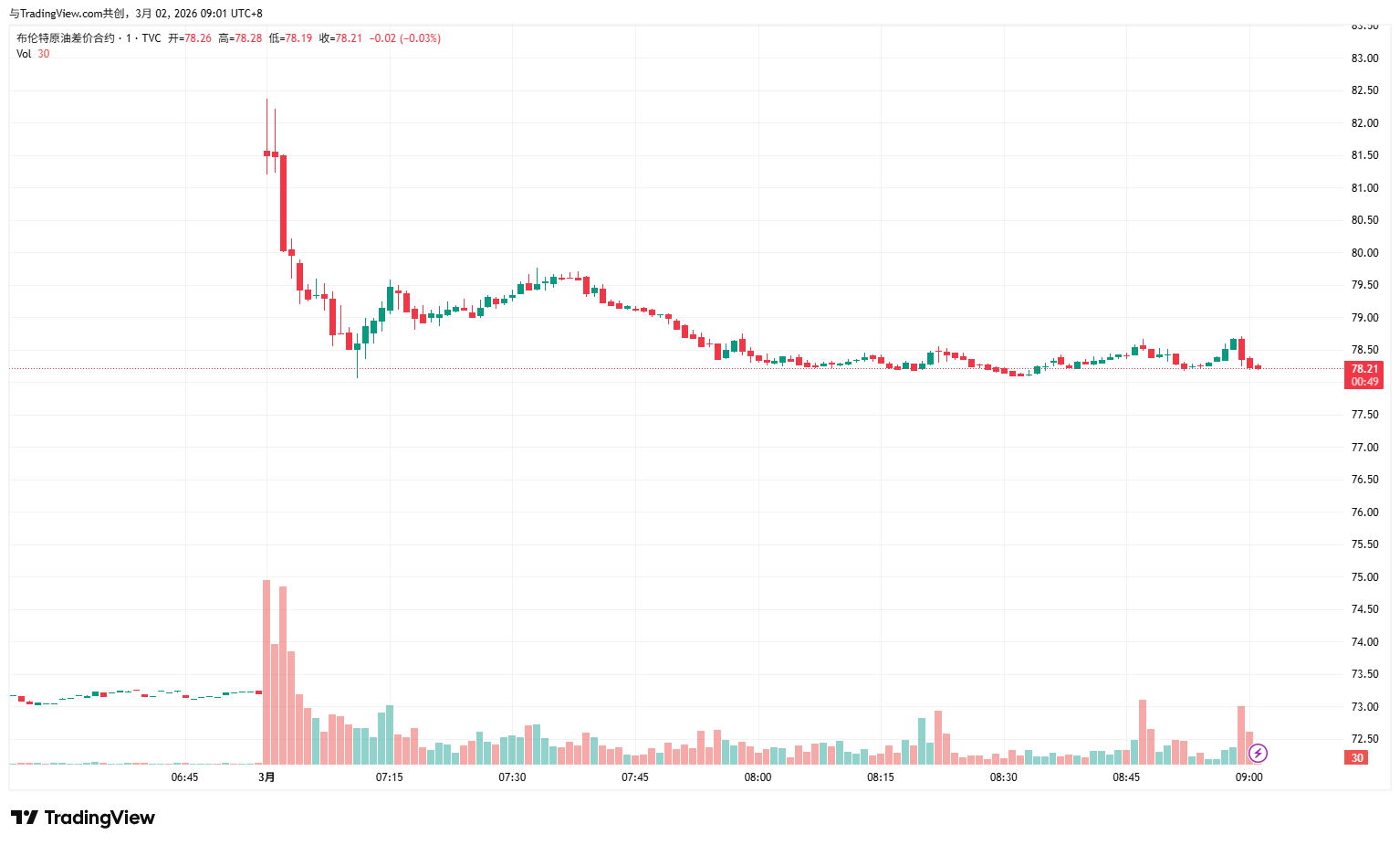 国际基准布伦特原油开盘即跳涨约13%,盘中最高触及每桶82美元,随后涨幅有所缩小。