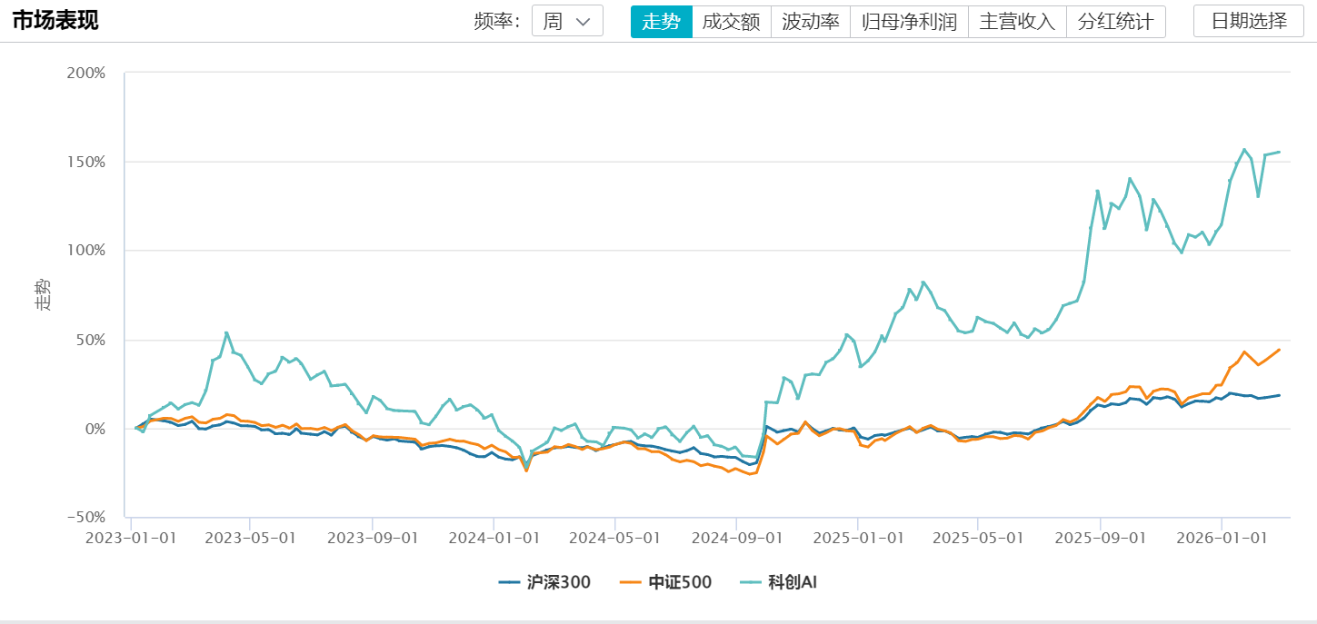 自2022年12月30日基日以来,科创AI指数展现出强劲的长期增长动能。截至2026年2月27日,该指数累计涨幅高达167.65%,而同期沪深300涨幅仅21.67%,中证500涨幅13.65%。这意味着在近三年半的时间内,科创AI指数收益率是沪深300指数近8倍,超额收益显著。