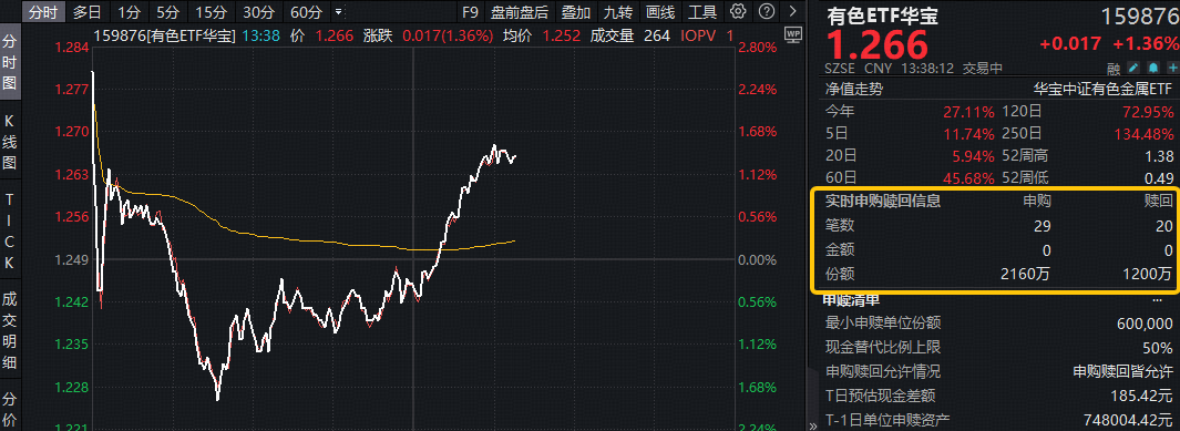 3月2日,揽尽有色金属行业龙头的有色ETF(159876)午后快速拉升,场内价格盘中拉升1.5%,现涨1.36%,实时成交额1.33亿元,交投火热!截至发稿,获资金实时净申购960万份