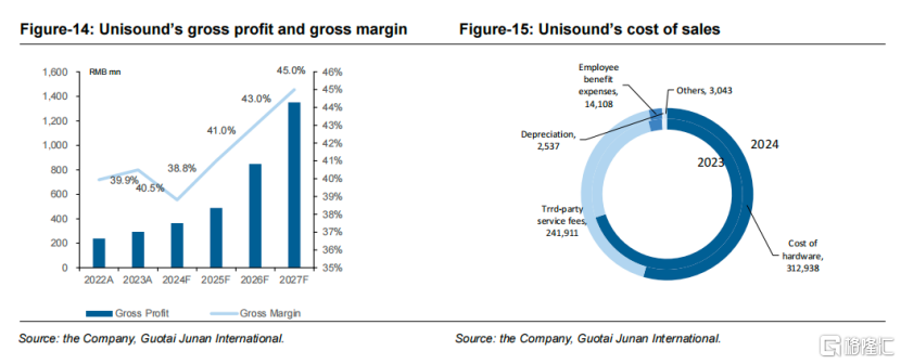 二是毛利率持续提升,2024-2027F毛利率从38.8%升至45.0%。从成本角度来看,这离不开硬件成本占比持续下降,且公司业务和技术成熟带来持续的规模经济,同时第三方服务费等边际成本逐步降低。