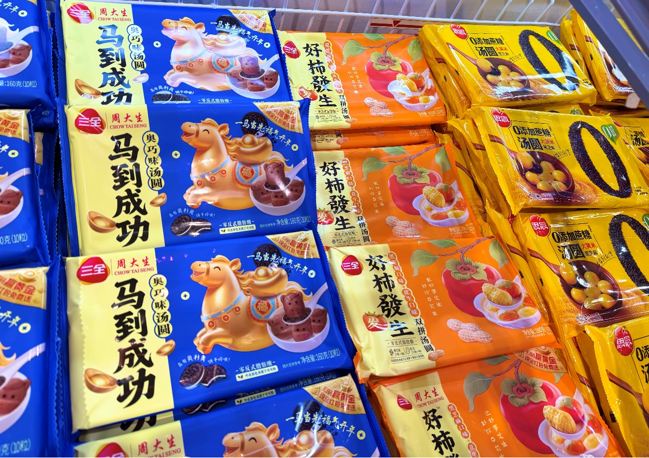 走进京东七鲜超市的汤圆元宵专区,多款与马年及吉祥寓意相关的商品稳居销售前列。其中,三全新推出的“马到成功奥巧味汤圆”,以应景的生肖主题结合巧克力奥利奥口味,精准“拿捏”了年轻消费者的尝鲜心理。而三全另一款“好柿发生花生黑芝麻双拼汤圆”,则将“好事发生”的口彩与经典口味巧妙融合,长期占据七鲜汤圆销量排行前列。经典品牌思念同样表现不俗,其推出的“柿柿如意”汤圆和造型萌趣的“招财进宝双拼招财猫汤圆”,因其喜庆外形与美好寓意备受青睐。
