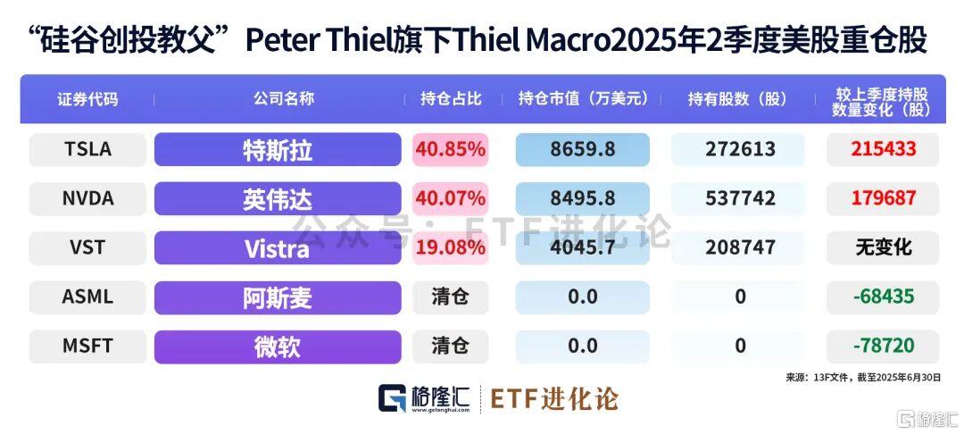 去年三季度,蒂尔基金便对其持有的54万股英伟达股票一键清仓,其持仓组合仅保留苹果、微软和特斯拉三只股票;二季度清仓阿斯麦。