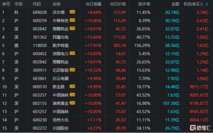 龙虎榜中涉及机构专用席位的个股中,单日净买入额前三为民爆光电、翔鹭钨业、白云电器,分别为1.86亿、1.25亿、1.06亿。