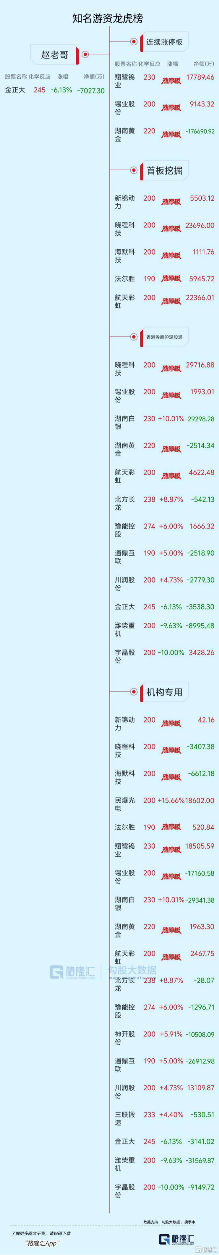 龙虎榜 |T王、杭州帮抢筹金正大超7700万,湖南黄金遭深南东路抛售超6200万