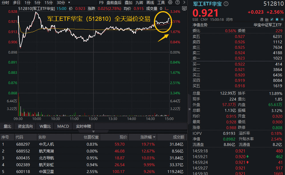 二、大变局!主力火速加码战略资产,军工ETF华宝(512810)上探3.34%,交投翻倍激增!成份股批量涨停!