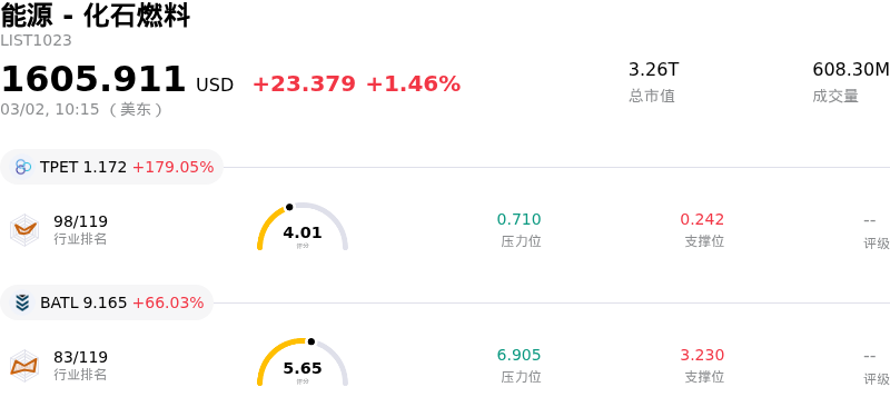 ConocoPhillips (COP) 盘中上涨4.02%, 所属行业能源 - 化石燃料上涨1.46% ,公司涨幅跑赢行业涨幅,行业涨幅前三股票 Trio Petroleum Corp (TPET) 上涨 179.05%;Battalion Oil Corp (BATL) 上涨 66.03%;Indonesia Energy Corp Ltd (INDO) 上涨 25.01%。