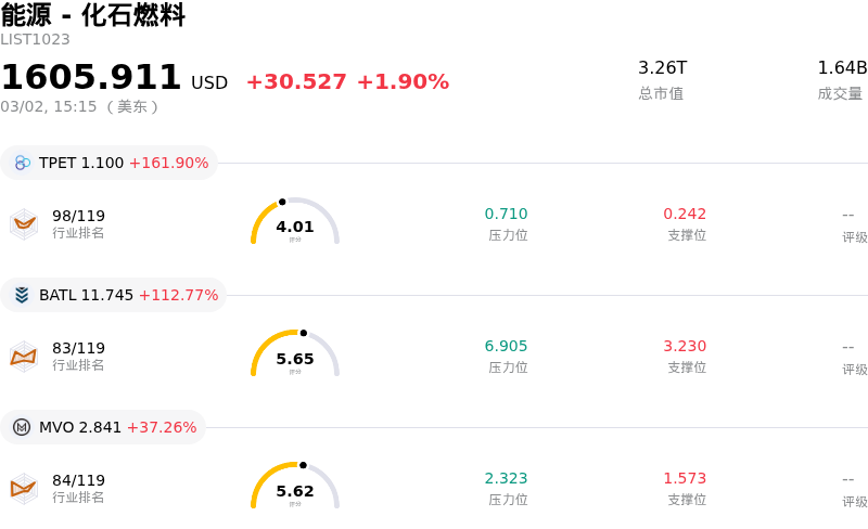 菲利普66公司 (PSX) 盘中上涨3.78%, 所属行业能源 - 化石燃料上涨1.90% ,公司涨幅跑赢行业涨幅,行业涨幅前三股票 Trio Petroleum Corp (TPET) 上涨 161.90%;Battalion Oil Corp (BATL) 上涨 112.77%;MV Oil Trust (MVO) 上涨 37.26%。