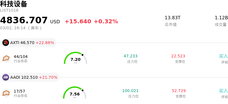 Dell Technologies Inc (DELL) 收盘上涨3.73%, 所属行业科技设备上涨0.32% ,公司涨幅跑赢行业涨幅,行业涨幅前三股票 Aeluma Ord Shs (ALMU) 上涨 24.66%;AXT Inc (AXTI) 上涨 22.88%;Applied Optoelectronics Inc (AAOI) 上涨 21.70%。
