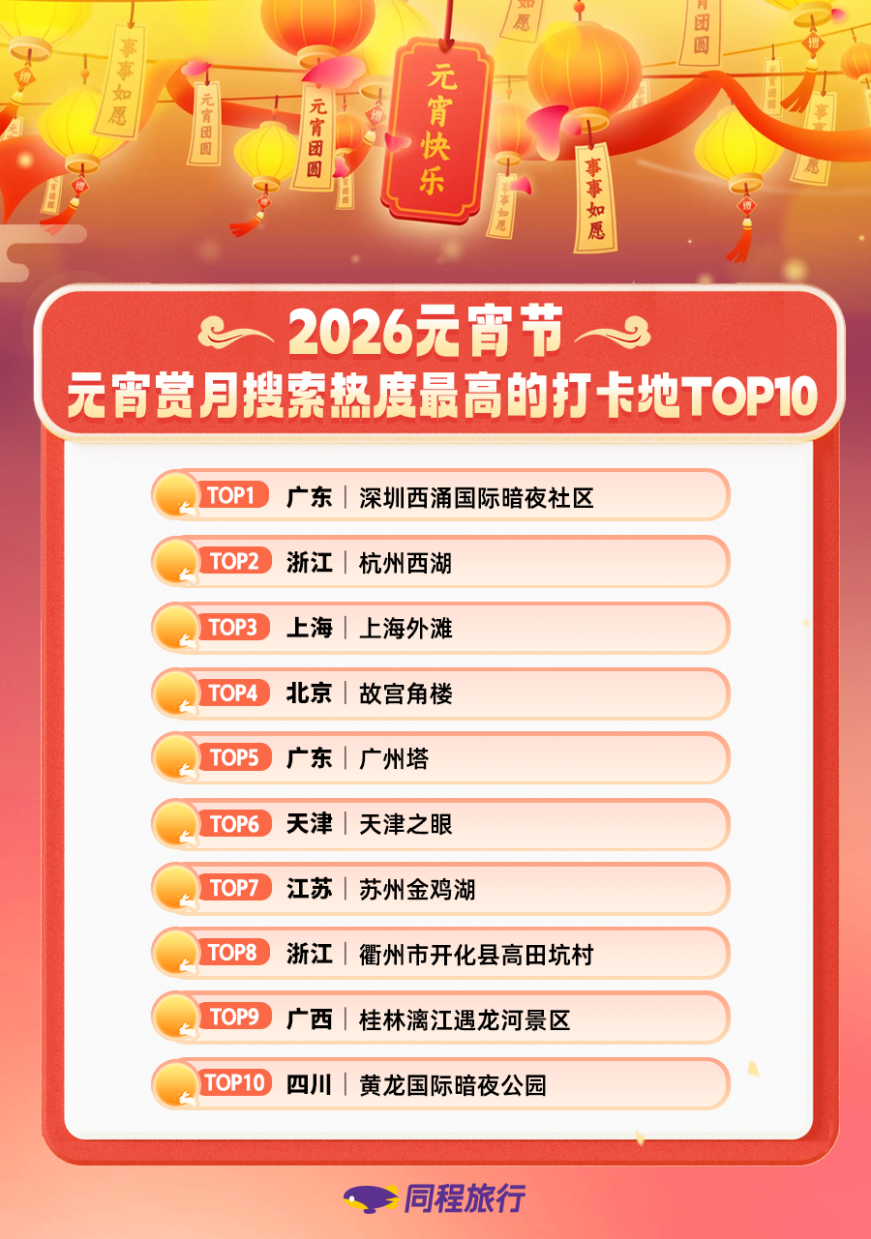 同程旅行数据显示,截至3月2日16点,元宵赏月搜索热度最高的十大热门打卡地中,不仅包括杭州西湖、上海外滩、北京故宫角楼、天津之眼、广州塔、苏州金鸡湖、桂林漓江遇龙河景区等知名景点,深圳西涌国际暗夜社区、四川黄龙国际暗夜公园、浙江衢州市开化县高田坑村等热门观星旅游目的地,搜索热度同样旺盛。其中,深圳西涌国际暗夜社区搜索热度较上周同期增长超 110%,领跑国内赏月打卡地热度榜单。