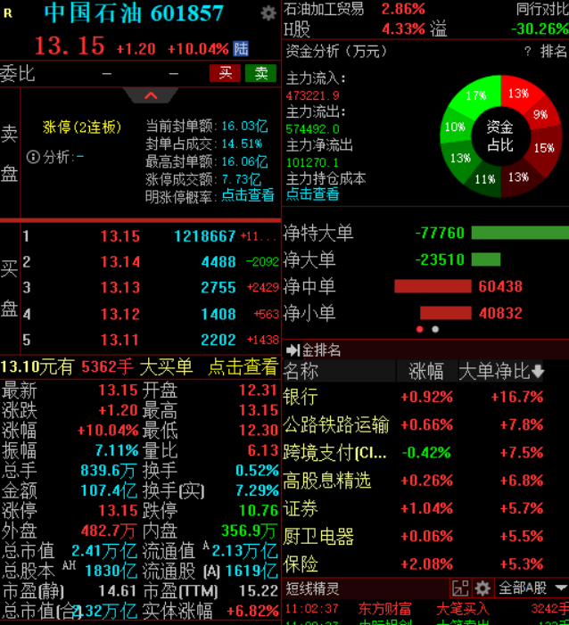 油气板块成为今日亮点,盘初持续走强,准油股份、洲际油气等多只个股涨停。中国石油A股再度涨停(2连板),成交额突破100亿元,显示资金活跃度高涨。