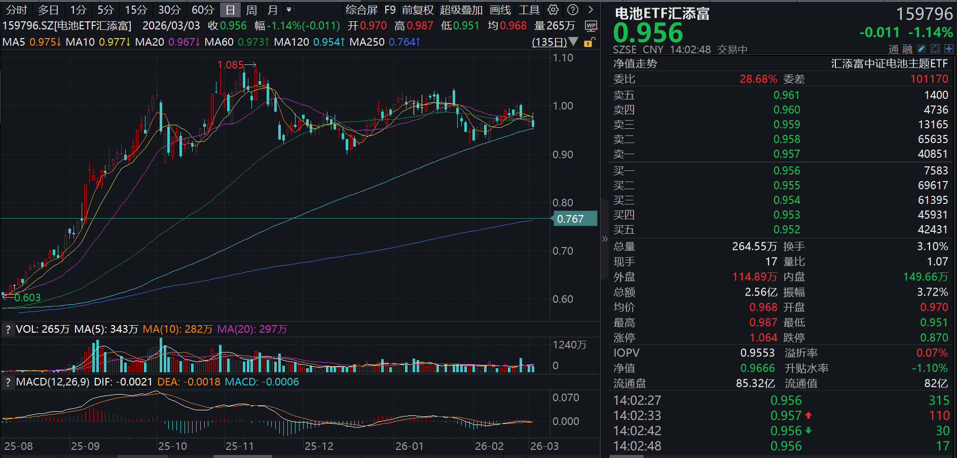 3月3日,A股市场震荡走弱,上证指数午后跌逾1%,电池ETF汇添富(159796)盘中冲高后回落,午后随大盘震荡走低,当前跌逾1%,成交额超2.5亿元,交投活跃。