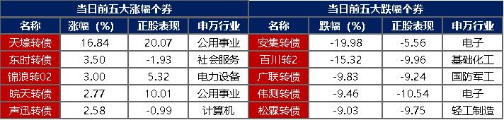 【转债市场主要指数集体跟跌】 3月3日,转债市场跟随权益市场明显下行,中证转债、上证转债、深证转债分别收跌1.81%、1.71%、1.98%。转债市场成交额768.75亿元,较前一交易日放量44.89亿元。转债市场个券多数下跌,376支转债中,26支收涨,334支下跌,16支持平。当日上涨个券中,天壕转债涨超16%,东时转债、锦浪转2涨超3%;下跌个券中,安集转债跌逾19%,百川转2跌逾15%。
