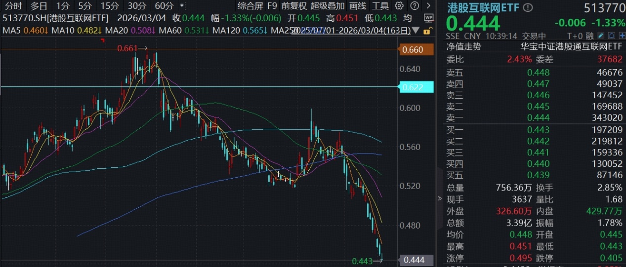 3月4日,港股早盘低开,恒指、恒科指双双跌逾1%,港股AI核心资产——港股互联网ETF(513770)场内价格现跌涨1.33%,下探2025年7月以来新低。互联网龙头多数回调,阿里巴巴-W跌超3%,美团-W跌近2%,腾讯控股跟跌0.88%。