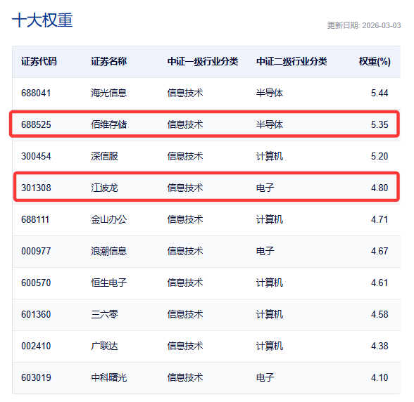 截至3月3日,佰维存储在信创ETF汇添富(560850)标的指数中的权重高达5.35%,指数的第二大权重股!权重甚至远高于部分芯片类指数!