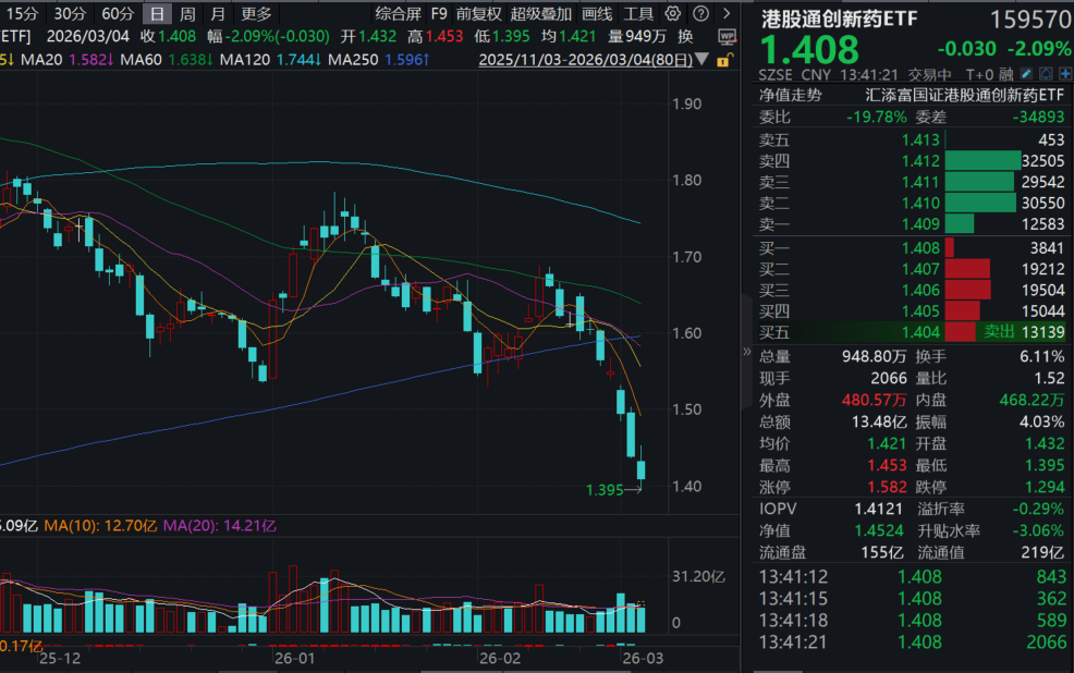 今日(3.4),港股震荡走低,创新药再度回调,创新药纯度100%的港股通创新药ETF(159570)跌超2%,连续第5天下跌,创去年6月4日以来新低!盘中成交快速突破14亿元!最新规模超225亿元,同类遥遥领先!