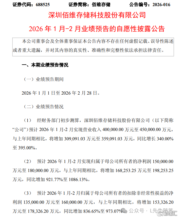 昨晚,国产存储芯片企业佰维存储披露2026年1-2月主要经营数据,公司归母净利润达到15亿元至18亿元,同比增长超9倍,最高接近11倍,两个月就赚足了2025年全年净利润的两倍有余。