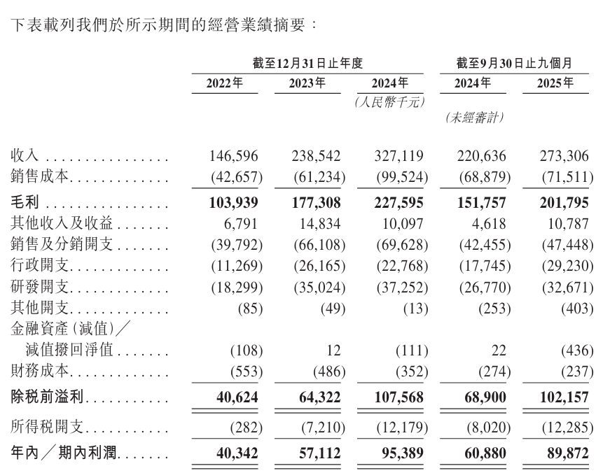 净利润表现同样亮眼。期内利润从2022年的4034万元增长41.5%至2023年的5711万元,2024年进一步跃升至9539万元,同比增长67.0%。2025年前九个月净利润达8987万元,同比增长47.7%,净利率提升至32.9%,盈利能力持续增强。