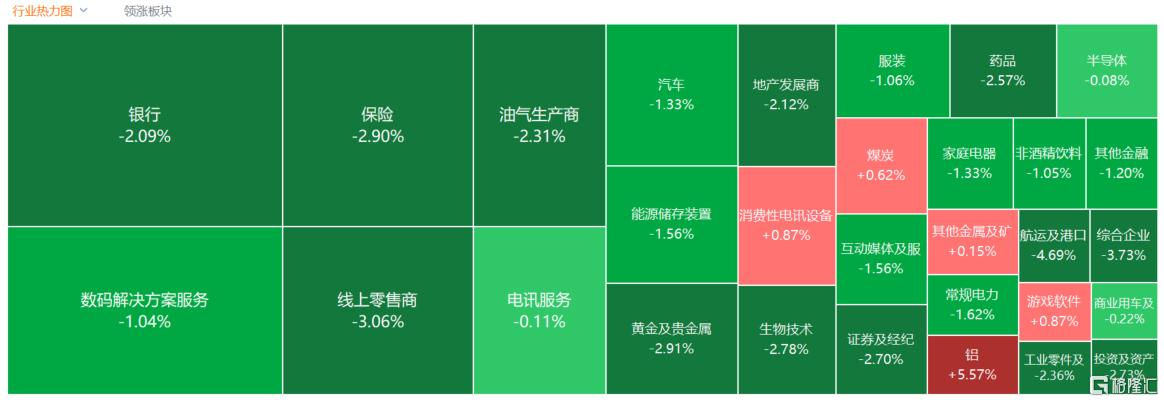 盘面上,作为市场风向标的大型科技股集体下跌,阿里巴巴、百度、京东、腾讯盘中均创阶段新低;大金融股(银行、保险、券商)、中字头等多数权重低迷大市继续承压;石油股、黄金股等避险板块大幅回撤;随着中东冲突导致往返迪拜的大部分航空运输停摆,航空股继续跌势。另一方面,AI算力爆发催生需求,电力设备股集体强势;全球9%电解铝产能受扰,机构看好铝板块行情,铝业股逆势上涨,军工股、存储概念股、煤炭股部分活跃。