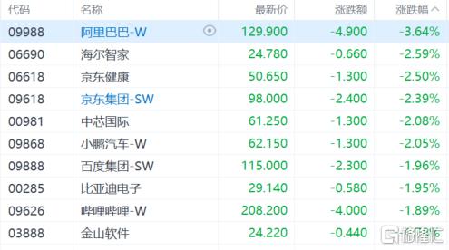 大型科技股多数下跌,阿里巴巴跌超3%,京东、中芯国际、小鹏汽车跌超2%,百度、比亚迪电子等跟跌。