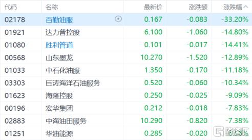 油气设备股重挫,百勤油服跌超33%,达力普控股、胜利管道跌14%,山东墨龙跌超12%,中石化油服、中海油田服务等跟跌。