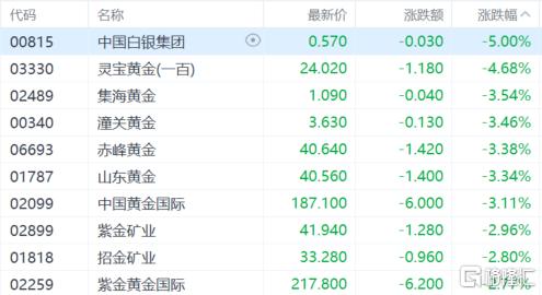 黄金及贵金属股大跌,中国白银集团跌超5%,灵宝黄金跌超4%,集海黄金、潼关黄金、赤峰黄金等跟跌。