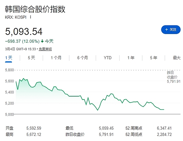 随着恐慌情绪不断加剧,韩国KOSPI指数暴跌8%后,触发熔断机制,交易暂停20分钟。这是韩股盘中触发自2024年8月以来首次熔断,并连续第二个交易日触发交易限制。韩国KOSPI指数收盘跌12.11%,创历史最大单日跌幅,报5093.54点。仅本周,韩国股市市值已蒸发4,300亿美元。